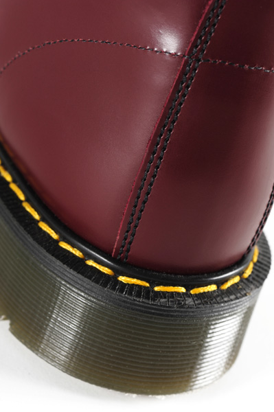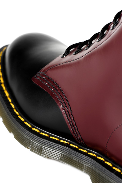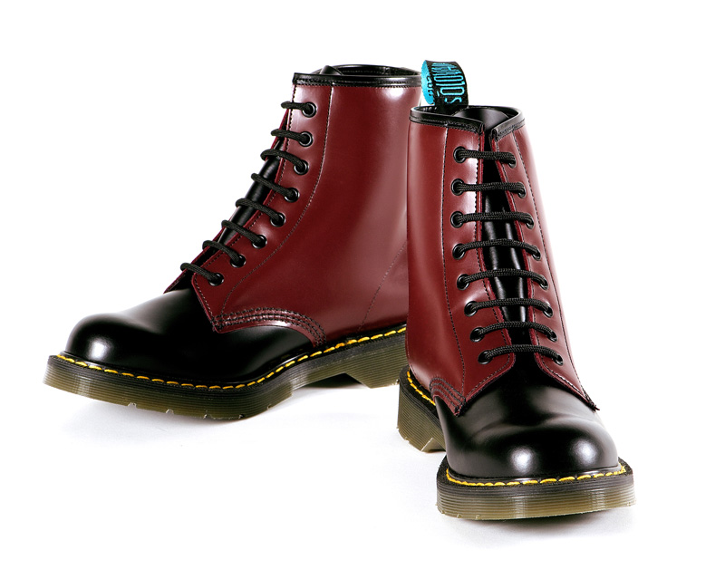 ブラックとチェリーの2トーンカラー配色の別注8ホールブーツ。クッション性の高いソールにはMADE IN ENGLANDの文字が刻印され、履き口部分にはブランドロゴ刺繍ラベル、コバ部分にはイエローステッチ。
