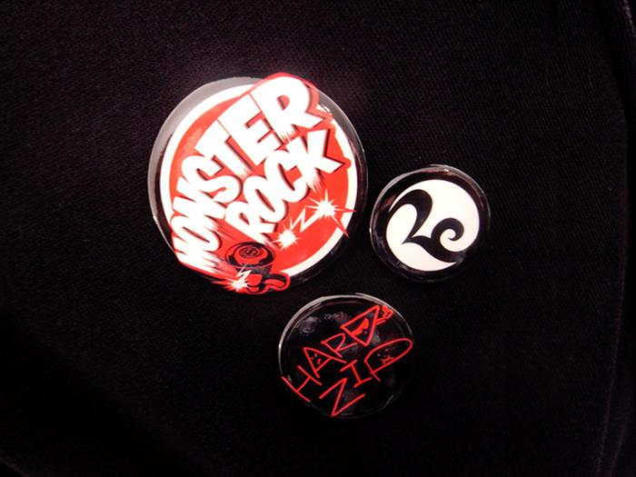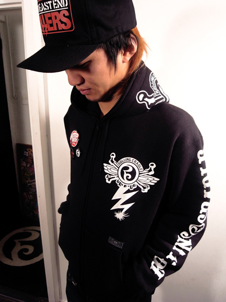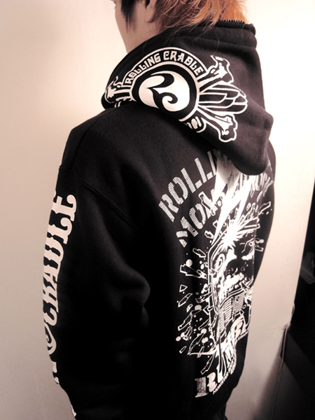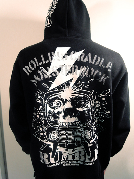 フード、左胸、バック、左袖とマルチプリントを施した、9ozの裏起毛スウェットパーカ。 フロントジップはフード最上部まで閉まるプラスチックのビスロンタイプジップを採用。 自分仕様にカスタムできるバッジ3種類[MONSTER ROCK LOGO][ロリクレLOGO][ダイスケはんデザイン]付き。